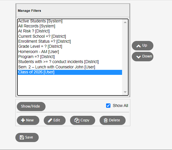 a set of criteria to selectively screen out incoming information, such as "all active students" or "former students" that you own,