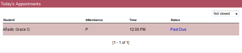 This widget shows the appointments scheduled for today, including each student's current attendance, the time of the appointment, and its status (Past Due or Upcoming). Click an appointment status to create a new health log entry for that student. The appointment's status changes based on the status of the health log entry.