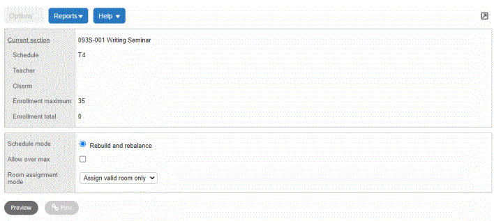 This option is for a newly created section and will fill this section from the other sections of this course and rebalance the numbers in all the sections. If necessary, it will change a student’s schedule to make this happen.