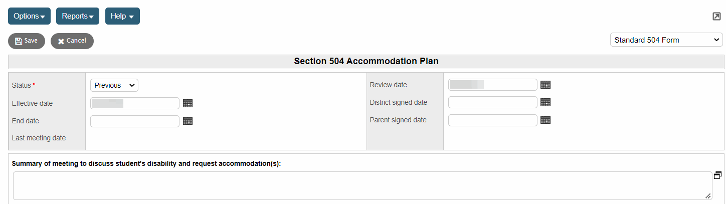 5. On the Options menu, click Add. The Section 504 Accommodation Plan page appears: