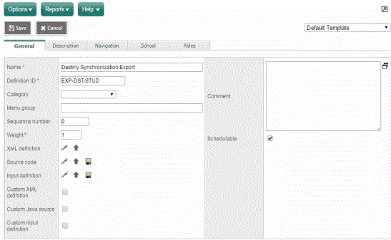 - Find and click Destiny Synchronization Export. The Destiny Synchronization Export details page appears. The Schedulable checkbox should already be selected.