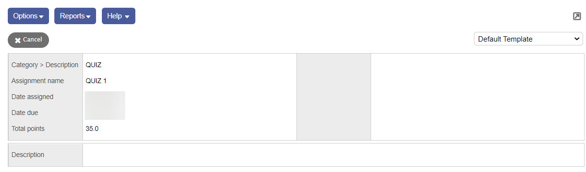 the list of assignments to a specific category. - Click the Grade Term drop-down to filter the list of assignments to a specific grade term. The assignment list displays the date assigned, date due, total points, and score.